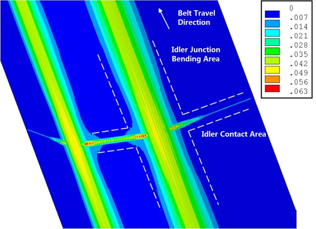The conveyor belt bends at the junction between idler rolls. The bending creates compression in the belt’s top cover and tension in the bottom cover. The extent of this deformation depends on the idler arrangement, belt properties and belt loading. Figure 1 shows a finite element analysis (FEA) of the deformation in a steel cord belt on three-roll trough (idler set not shown in the figure). The idler junction bending area is along the belt travel direction, symmetric along the belt centre line, and separates the belt’s contact between the centre roll and wing roll.