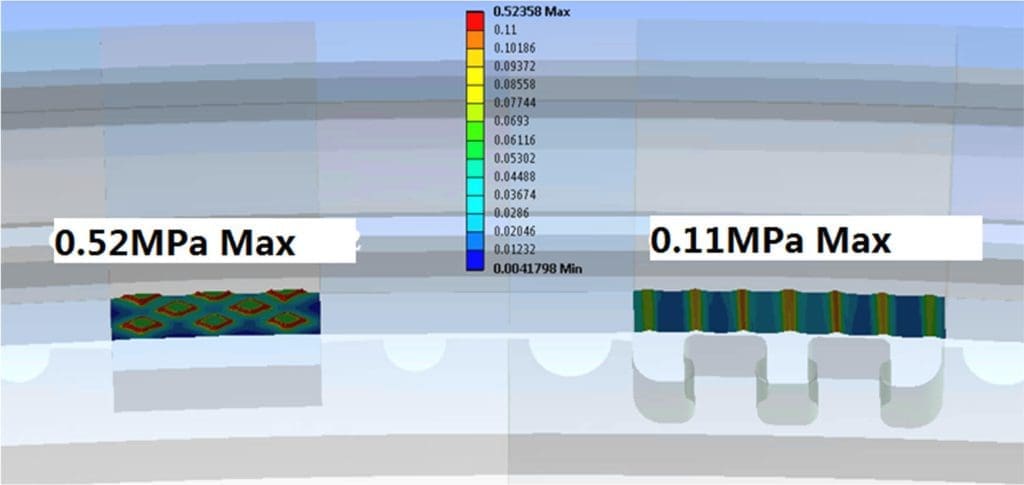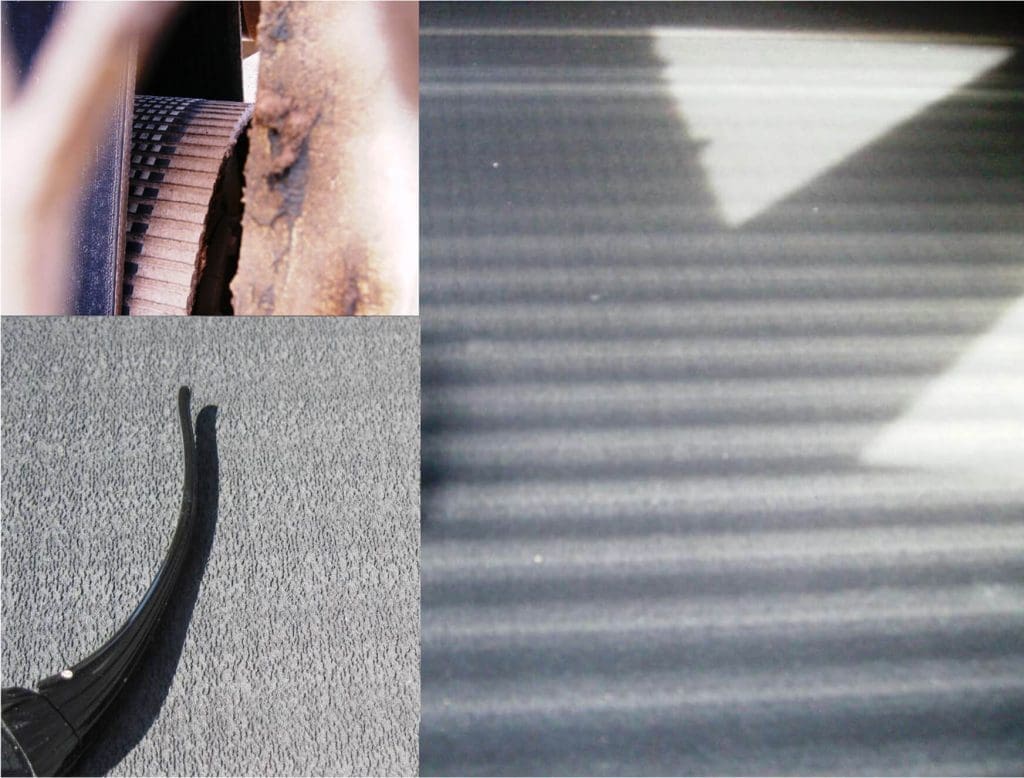 Ceramic pulley laggings are chosen over rubber pulley laggings for their superior wear resistance and higher friction coefficient. Manufacturers provide different types of ceramic lagging tile designs. Certain ceramic lagging is designed to provide a greater friction coefficient between the belt and pulley, usually by introducing small, sharp- edged protrusions on the lagging surface. The protrusions are intended to penetrate into the belt bottom cover and provide greater resistance against the slipping motion of the belt. However, from analysis of classic contact mechanics5, it is known that on a drive pulley, certain slipping is intrinsic to the interaction between belt and pulley. Aggressive ceramic lagging design, in combination with high tension ratio on a drive pulley, can potentially cause premature belt cover failure. Figure 9Figure 9 shows the wear marks on the belt bottom cover produced from ceramic lagging tiles, where the spacing of the white stripes (wear marks) match exactly the spacing of the ceramic lagging tiles. The abrasive wear on the belt cover can be identified in the lower left image. Ceramic lagging tile design affects the contact stress. Figure 10 shows two different ceramic lagging tiles: the left lagging tile has sharp protrusions and the right lagging tile has a wavy surface. Under the same contact condition (belt tension and pulley diameter), the contact stress is more than four times higher on the lagging tiles with sharp protrusions. Indeed, the higher contact stress can provide more ‘grip’ between the belt and pulley, but can also add to the possibility of belt cover damage.