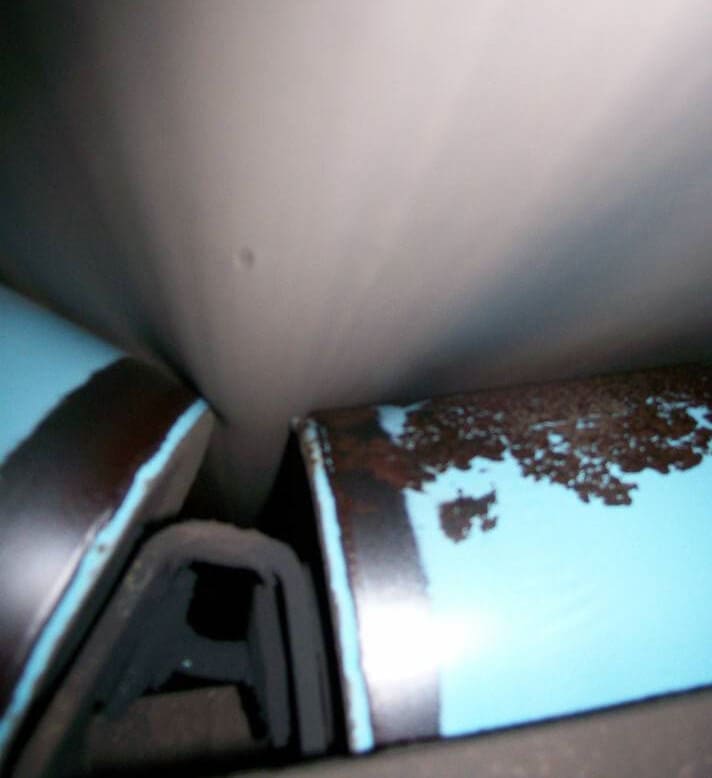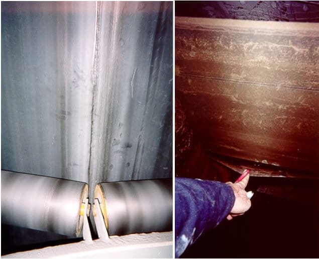 In an inline idler arrangement, where all rolls are on the same plane, there is a gap between adjacent idler rolls. If the gap is wide enough and the belt’s idler junction bending is severe enough, the belt may contact the idler edge. Figure 3 shows an example of a belt contacting the idler edge. When this scenario occurs, the idler edge acts like a knife edge, where the contact stress between belt and idler edge is very high. This leads to an excessive rate of cover wear. Well designed and manufactured inline idler sets should have an idler gap of less than 10 mm to avoid potential contact with the belt.