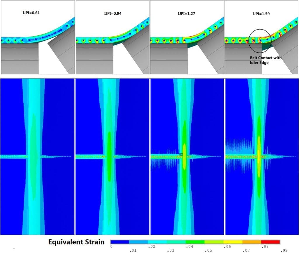 Conveyor Dynamics Inc. (CDI) developed the Idler Junction Pressure Index (IJPI) as a quantitative tool to indicate the idler junction bending stress. The IJPI allows the designer to explore various conveyor and belt parameters like idler spacing, diameter, roll lengths, belt speed, belt thickness and etc., to reach an optimal design while maintaining allowable idler junction bending. Higher IJPI values mean more bending deformation. As a general design criterion, the IJPI should not exceed 1.0~1.2 range. Figure 4Figure shows a finite element model of the idler junction bending in a 1200 mm wide, 13.5 mm thick belt on a 35° degree trough. The material loading has been adjusted to achieve four different IJPI values, from low to high. It is obvious that the strain and idler junction bending increases with a higher IJPI value from 0.61–1.59. IJPI = 1 can be viewed as a relatively conservative limit. When the IJPI exceeds 1.2, the belt bending becomes severe. At IJPI = 1.59, the belt starts to contact the idler edge.