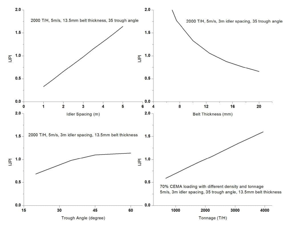 To illustrate the relationship of the IJPI to conveyor and belt parameters, Figure 5 shows different IJPI values on the same 1200 mm wide belt, at 70% CEMA loading and 5 m/s belt speed, but with varying idler spacing, belt thickness, trough angle and tonnage. Some weight related factors, like idler spacing and tonnage, show a linear relation to the IJPI. Some bending related factors, like belt thickness and trough angle, show a non- linear relation to the IJPI. For example, the IJPI increases beyond a linear relationship with reduced belt thickness.