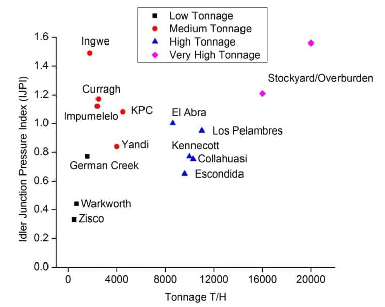 The fourth and final category is very high tonnage conveyors over 15 000 t/h. This type of conveyor is located in large stockyards in bulk material handling ports or surface mining operations. They do not necessarily have long lengths or a high incline/decline angle, but are characterised by wide belt and very high tonnage. The IJPI can increase very quickly with a normal three-roll trough even with reduced idler spacing. Careful consideration of idler spacing and trough arrangement should be taken to limit the idler junction bending.