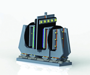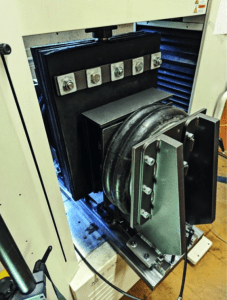 To conduct a test, constant face pressure is applied to the lagging/belt contact via pneumatic bellows. The presence of bellows on either side of the sample allows higher face pressures to be tested, and facilitates a ‘self-centring’ design, should any compression occur of the belt or samples during testing. The upper cross-head is set to the slip velocity specified, and the resultant friction force is measured. This is subsequently repeated at different face pressures, velocities, and in the coming months, temperature.