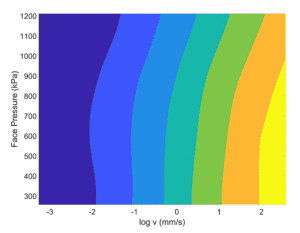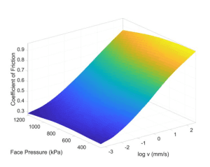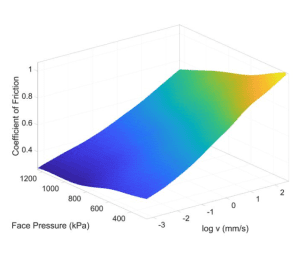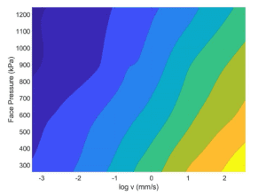 The surface and contour plot shown in Figure 4 illustrates how the coefficient of friction varies over the range of face pressures and velocities. As can be seen, higher face pressures correspond to a lower coefficient of friction, as does a lower sliding velocity. The velocity and load dependency cause a changing coefficient of friction from less than 0.3 to over 1.0.