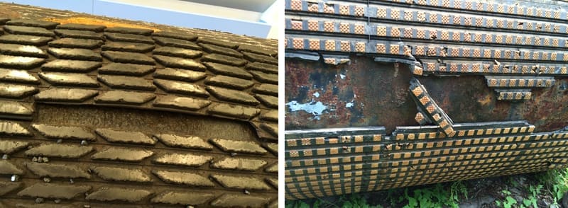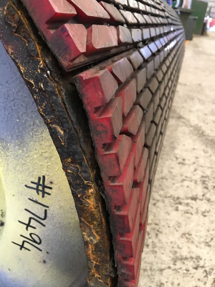 This has resulted in greater contact and adhesion between the lagging and the pulley shell directly below the raised lagging areas, and lower contact and adhesion in the recessed lagging areas. When the pulley shell ends are exposed to wet conditions, the water is able to penetrate between the lagging and the pulley shell at the areas below the recessed lagging profile. Once shell corrosion begins, it quickly spreads around the shell end, the lagging lifts from the pulley shell, and is easily damaged (see photos below).