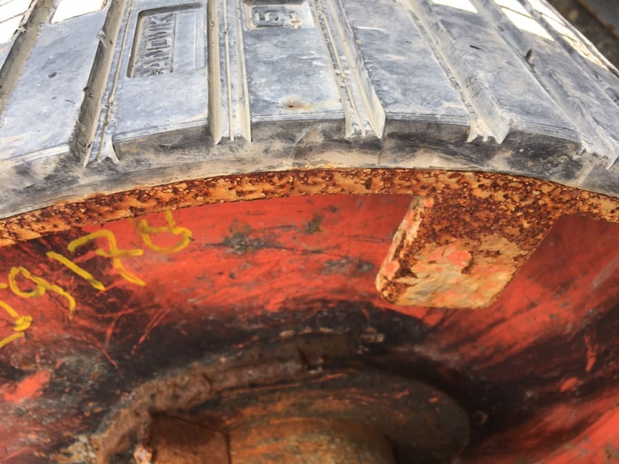 Photos #14 and #15 below show the results of operation at the same mine site of a pulley lagged with cold vulcanised ceramic lagging and one lagged with Elastotec Hot Vulcanised Ceramic Lagging. Both pulleys were installed at a large copper mine and operated in wet conditions where the water was acidic. There is corrosion evident on the end discs and locking elements of both pulleys. On the pulley with the cold vulcanised lagging there is severe edge lifting failure. The pulley with the Elastotec Hot Vulcanised Ceramic Lagging shows no sign of edge lifting and the lagging remains fully serviceable.