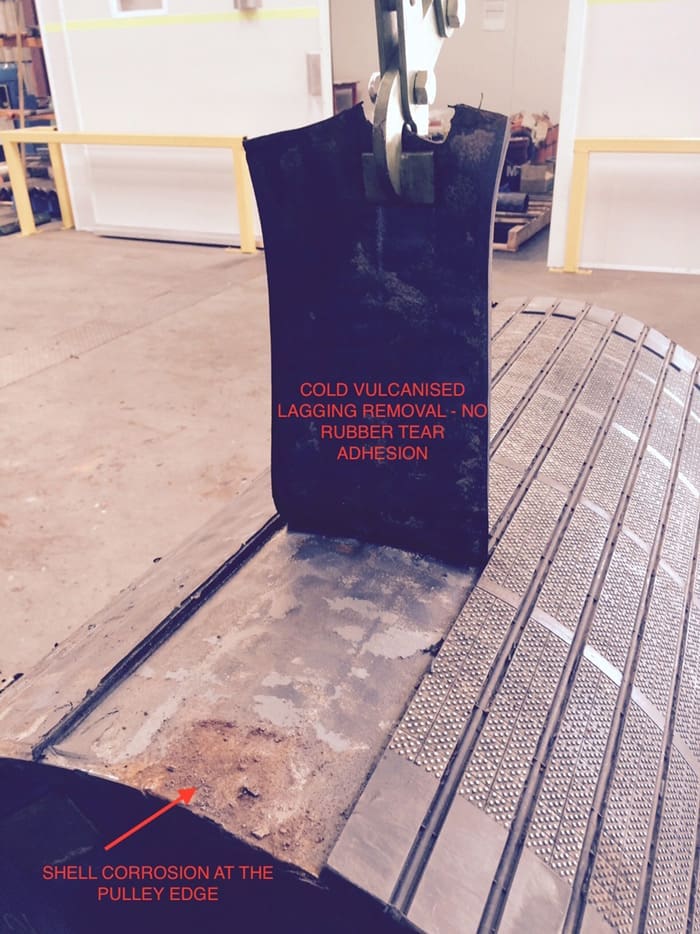 It has been well documented that cold vulcanised bonding of pulley lagging increases the likelihood of premature lagging failure due to debonding from the pulley shell, edge lifting, and corrosion of the shell at the joints between lagging strips. In many cases, these types of failures, require relagging on the conveyor, resulting in loss of production. Because the conditions for lagging on the conveyor are less than ideal, these problems often reoccur.