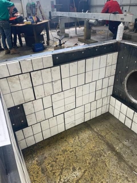 Prior to rubber lining and painting of the slurry box the ceramic liners were fitted to ensure dimensions were correct and identify any problems. Each of the cut liners had been fabricated to a dimensional tolerance of +/-2mm