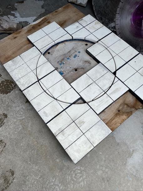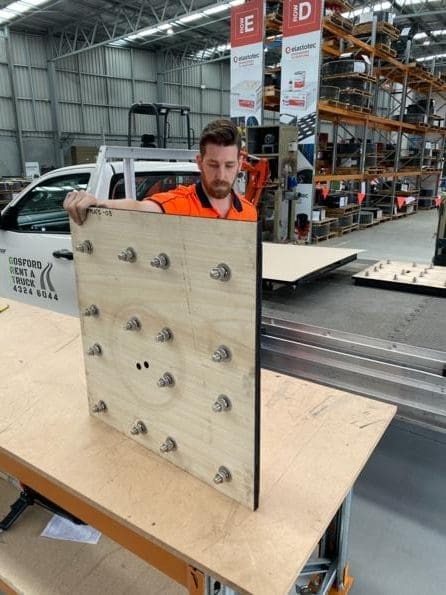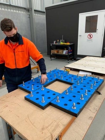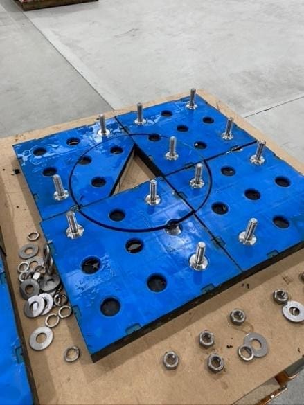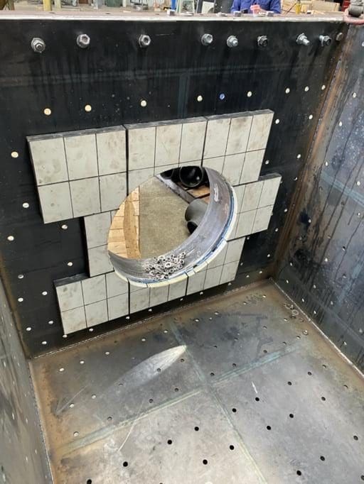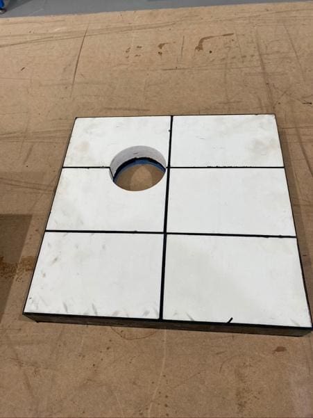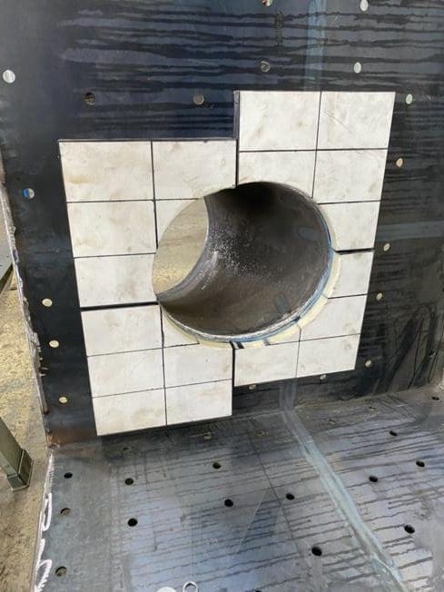 For the ceramic wear panels that required holes to be cut the panels were bolted into place on a plywood template that was marked with a centre hole. Holes were then cut with 600mm, 350mm, 338mm and 75mm diameters to suit the attached pipe work.
