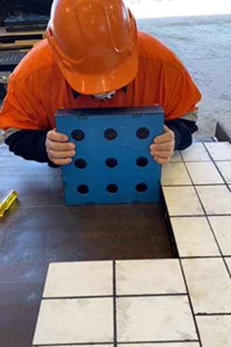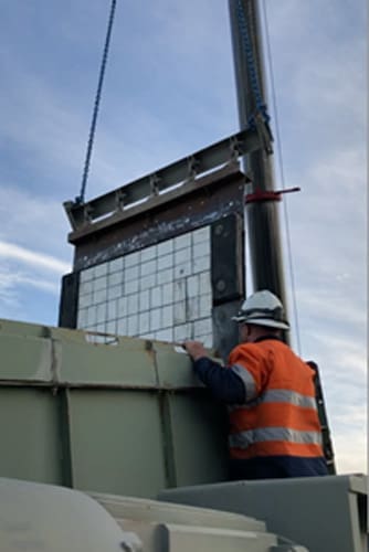 Following a presentation to site maintenance personnel on the Magnefast Wear Panel System, the train load out transfer chute deflector was selected for an initial installation. Ceramic Magnefast panels were chosen to replace the existing rubber wear liners with the expectation that this would provide longer service life. The liners used were 300 x 300 x 63mm that are made up with 50mm thick aluminium oxide tiles bonded to rubber and with an engineering thermoplastic backing plate containing nine high strength magnets. Each wear panel was held in place with nine magnets giving a total holding force of > 450kg per panel.