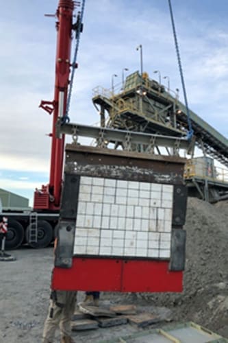 The deflector for the train load out station is mounted at the top of the chute approximately 25 metres in the air. This means that for liner changes craneage is required. The quick change out time for the Magnefast panels with the single sided attachment system, greatly reduces the liner change time which in turn reduces the time that the crane is required on site – this provides a substantial reduction in the cost of these shutdowns.