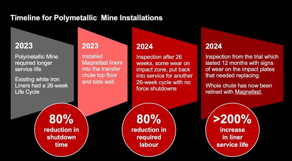 Magnefast trial achieved 6 MONTHS service life meeting the current liner objective. The Magnefast liners showed 7 mm of wear in a 50 mm thick ceramic, panels have not been replaced and are expected to eliminate several liner changes.
