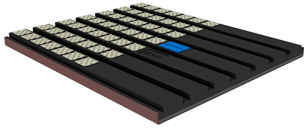 Elastotec ceramic pulley lagging is made using two different rubber layers extruded together. The top layer being the high abrasion resistant layer to which the tiles are vulcanised onto and the bottom layer being the adhesion CN bonding layer. Elastotec’s specially formulated neoprene based CN bonding layer is engineered to achieve ultimate adhesion when bonded to steel pulley surfaces. Elastotec’s CN bonding layer has a buffed finish to provide an optimum surface contact area that increases adhesion force.