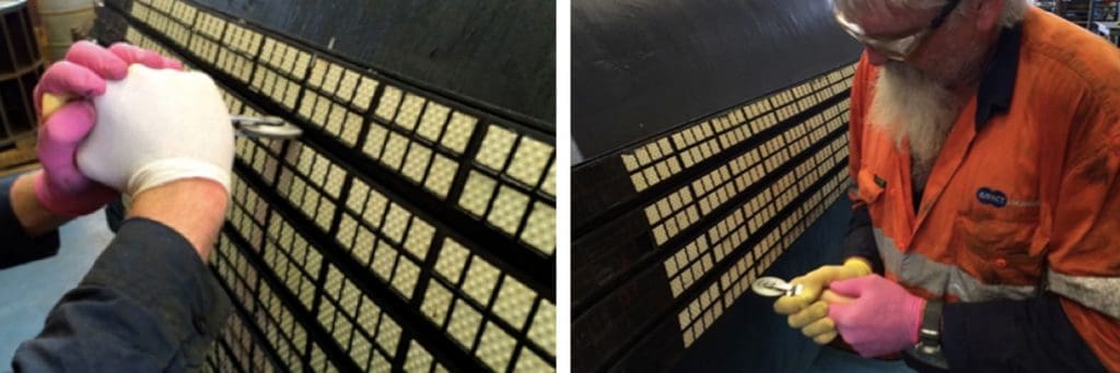 Lagging designs have sipes and grooves. One of the most important aspects on the lagging application is to obtain a reliable adhesion. Pressure applied to the lagging during the application is very important.