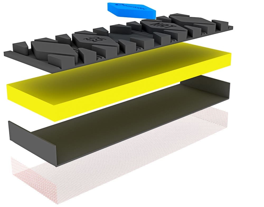 - Proven bonding system between abrasion resistant synthetic elastomer and CN backing coloured rubber.