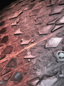 A tonnage-increase for an existing belt at a gold mine resulted in the installation of an ST-6300 conveyor belt, up from an ST-5600. Diamond rubber lagging was selected for the upgraded application given its flawless performance when installed on the drive pulleys before the upgrade. Following 4 weeks of operation with a heavier, higher-rated belt, catastrophic failure of the lagging occurred on both drive pulleys, as shown in Figure 2. This failure resulted in 3 days of unplanned downtime and ~$21m in lost production.