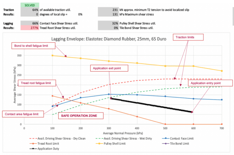 Finite element analysis (FEA) is used to define the fatigue limit of the lagging and the lagging shear modulus over the full range of normal pressure and surface shear stress conditions. The lagging capability is expressed in the form of a lagging performance envelope which evaluate the fatigue limit at each of the critical locations including:- Internally in the pulley lagging rubber