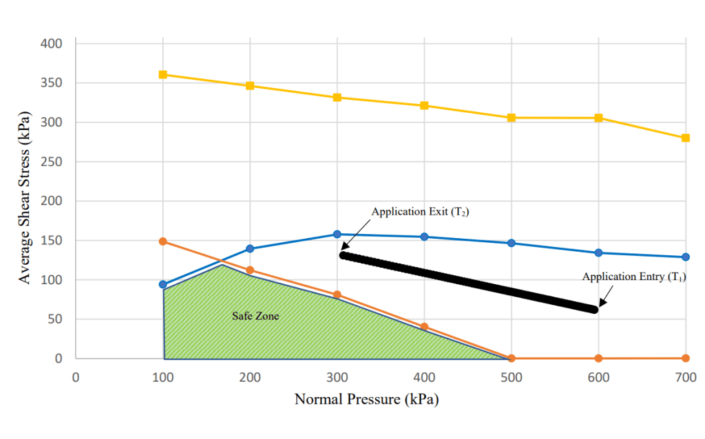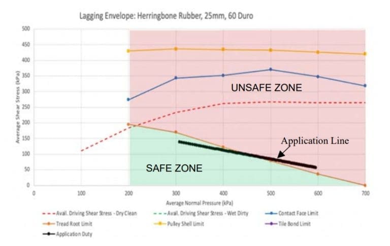 The second output of the tool, shown in Figure 8, defines the fatigue limits against average shear stress and normal pressure applied on the lagging. Figure 7 shows the location of the same fatigue limit lines on the lagging. Four different types of fatigue limit lines are produced – contact face limit (fatigue limit at the surface of the lagging in contact with the belt), tread root limit (fatigue limit at the base of the lagging profile, level with the grooves/sipes of the lagging), pulley shell limit (fatigue limit of the bonding between the lagging and pulley shell), and tile bond limit (fatigue limit of the bonding between the tile and rubber), as shown in Figures 7 and 8. The tile bond limit is only applicable in case of ceramic lagging.