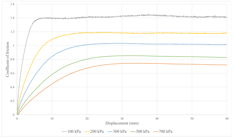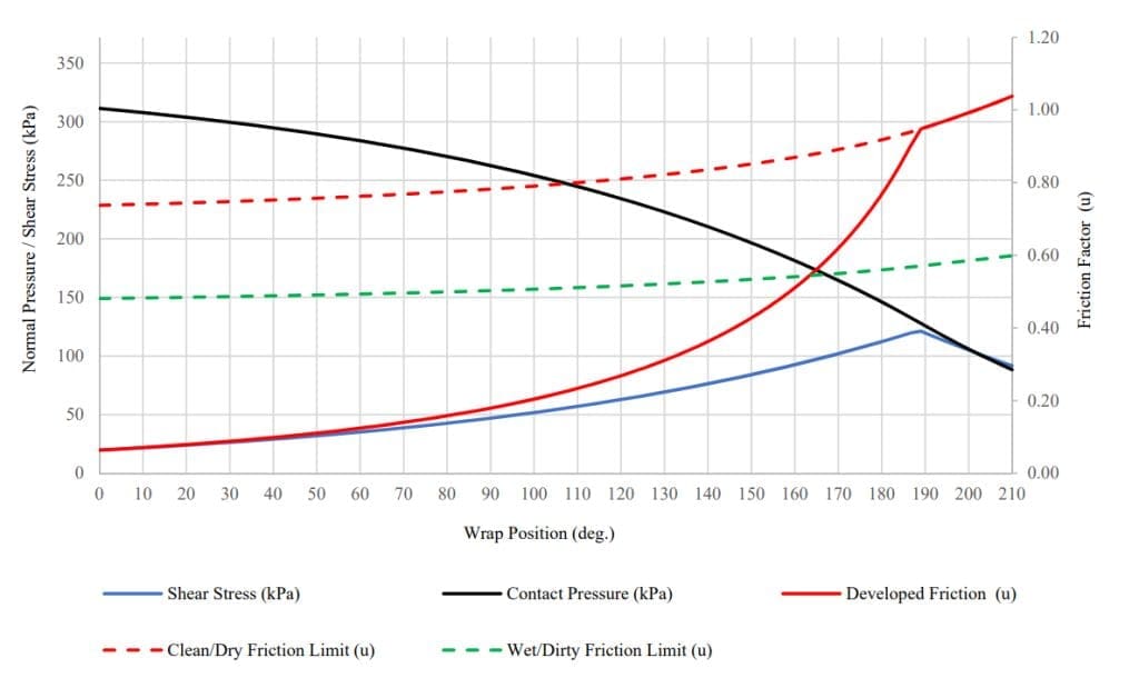 These friction values are used in the software tool to estimate localised slip between the belt and lagging as a function of normal pressure and contact shear stress.