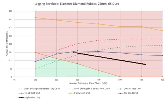 The fatigue life of the lagging rubber can be quantified as a function of the rubber shear stress. A phenomenological relationship between rubber shear stress versus fatigue life based on a library of test data has been developed by Conveyor Dynamics. On the basis of a typical conveyor pulley rotational speed of 60 rpm and a minimum rubber fatigue life of 5 years of operation at 90% utilisation, it is estimated that the pulley lagging will be subjected to approximately 1.4×10^8 cycles. The developed relationship has been applied to determine the maximum allowable rubber shear stress to achieve the required fatigue life of 5 years. It is assumed that the maximum allowable shear stress at the interface between the lagging rubber and both the pulley steel shell and ceramic tiles (where applicable) is similar on the basis that full bond strength is achieved. These maximum allowable shear stress values are used in the software tool to map the safe application area for each lagging product.